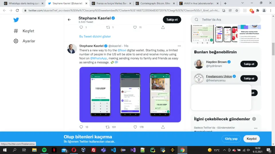 Stephane Kasriel, Çarşamba günü resmi twitter hesabından olarak Meta'nın yan kuruluşu WhatsApp'ın Meta'nın Novi cüzdanı aracılığıyla işlemleri test etmeye başladığını duyurdu. Kasriel'e göre, yeni özellik ABD'de "sınırlı sayıda kişi" için mevcut ve kullanıcıların WhatsApp'ta "anında ve hiçbir ücret ödemeden" para gönderip almasına olanak tanıyor. Kasriel , Meta'nın Ekim ortasında Novi pilot uygulamasını tanıtmasından bu yana, "insanlar için en önemli" özelliklerin ve işlevlerin neler olduğunu test edip öğrenebildiğini kaydetti. Novi'yi kullanmanın, her zaman uçtan uca şifrelenen WhatsApp kişisel mesajlarının ve aramalarının gizliliğini etkilemediğini de sözlerine ekledi.