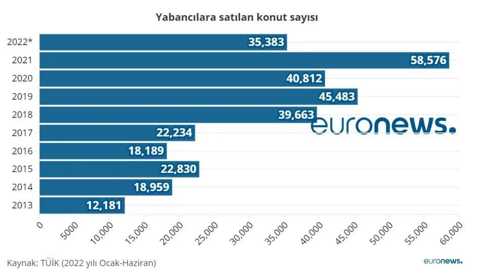 Yabancılar 2018’de 39 bin 663 konut alırken bu sayı 2019’da 45 bin 483 oldu. Covid-19 salgınının patlak verdiği 2020’de bu sayı 40 bin 812’ye gerilerken 2021’de tam 58 bin 576 konutu yabancılar satın aldı. 2022 yılının ilk 6 ayında ise bu sayı 35 bin 383 oldu.