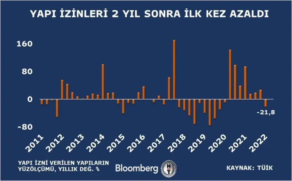 Türkiye İstatistik Kurumu (TÜİK) verilerine göre bir önceki yılın aynı çeyreğine göre, 2022 yılı ilk çeyreğinde belediyeler tarafından yapı ruhsatı verilen yapıların bina sayısı %22,5, daire sayısı %27,9, yüzölçümü %21,8 azaldı.