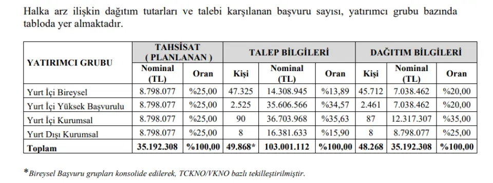 Halka arzda toplam 49.868 yatırımcıdan halka arz edilen 35.192.308 TL nominal değerli payların 2,9 katına denk gelen 103.001.112 TL nominal değerli filtrelenmemiş pay talebi gelmiştir. Halka arzda yurt içi bireysel yatırımcılara tahsis edilen payların 1,6 katı, yurt içi yüksek başvurulu yatırımcılara tahsis edilen payların 4,0 katı, yurt içi kurumsal yatırımcılara tahsis edilen payların 4,2 katı ve yurt dışı kurumsal yatırımcılara tahsis edilen payların 1,9 katı talep gelmiştir. Dağıtıma esas tahsisat oranları ise yurt içi bireysel yatırımcılar için yüzde 20, yurt içi yüksek başvurulu yatırımcılar için yüzde 20, yurt içi kurumsal yatırımcılar için yüzde 35 ve yurt dışı kurumsal yatırımcılar için ise yüzde 25 olarak gerçekleşmiştir.''