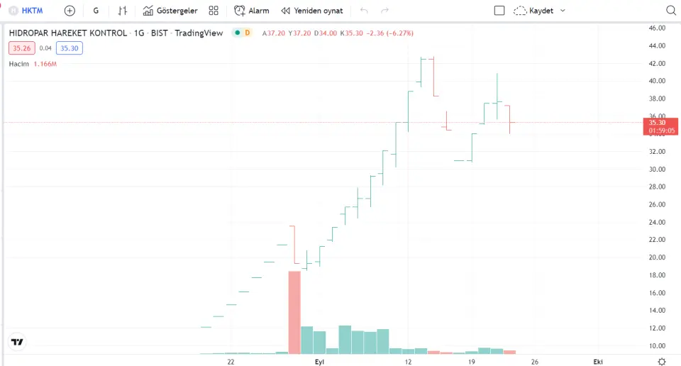 A1 Capital Yatırım liderliğinde geçtiğimiz Ağustos ayında 12 milyon payını halka arz eden Hidropar Hareket Kontrol Teknolojileri (HKTM) yüzde 288 değer kazandı. Tedbirlerden sonra hisse değer kaybetmeye başladı.