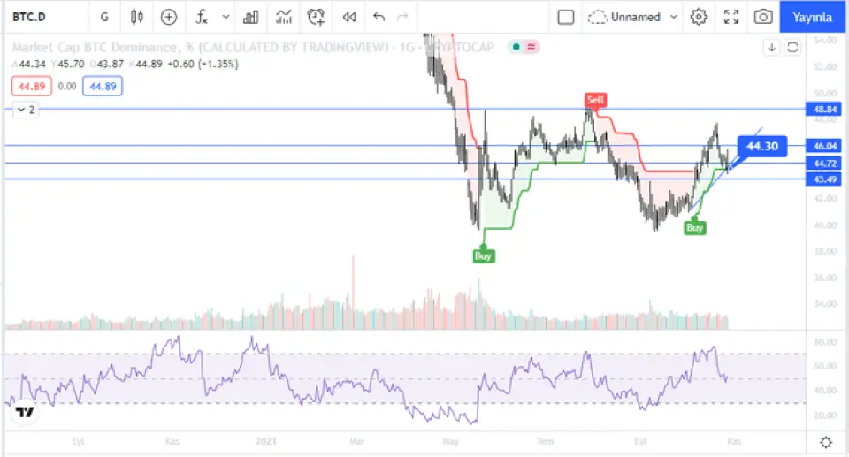 DOMİNANCE günlükte 44,30 altında kapanış yapması lazım ki altcoinler biraz nefes alsın. Altında kaparsa 43,49 a kadar gelebilir. Sert gelen BTC satışından sonra altlar iyice ezildi. Düzeltme ise bu gece kapanışlar iyi olur yoksa tehlike çanları çalar.