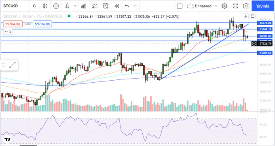 Günlükte 58,500 $ desteğinden güç alıp yukarı yaptı fakat 60,500 $'dan tepki alıp geri çekildi. Senaryo gereği 60,500 $ üstü kapanış gelmesi lazım. 50 günlük hareketli ortalama desteği sürüyor.