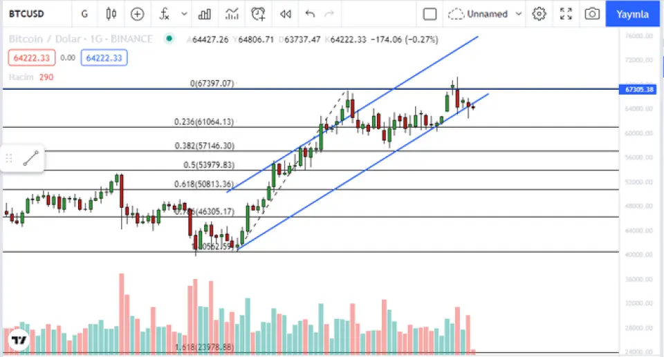 Kanal dışına çıkmış ama daha kapanış gelmedi gün sonuna kadar 65500$ üstünde kapatırsa kanala geri döner. Kanal dışı kapanış gelirse 63000$ - 61000$ testini yapabilir.