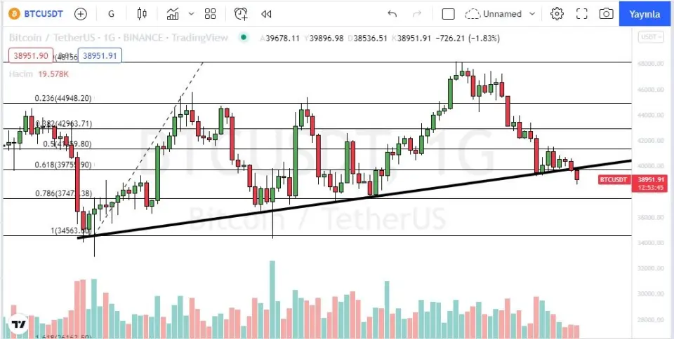Günlük grafikte, yükselen trend kırılmış görünüyor. Gün kapanışı önemli. 39500 altı kapanış olursa 37500 seviye testi gelebilir. Trend devamı için bu gece saat 3.00'de, 40000 seviyelerinden kapanış gelmesi lazım.