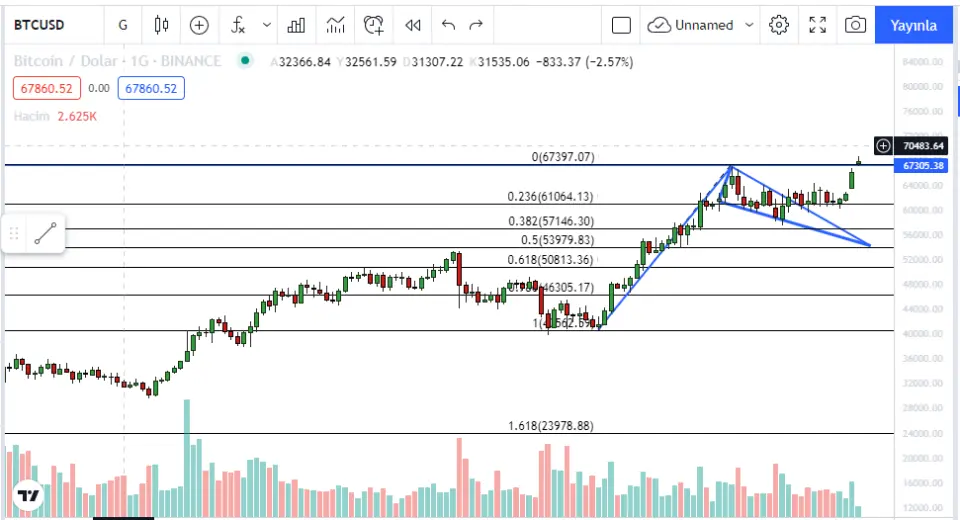 Günlükte boğa iştahı devam ediyor yeni tarihi zirveler yapmaya başladı. Fibonacci üst seviyesinde tutunduğu sürece yani 67397$ seviyeleri üstünde kapanış gelirse 72000$'lar konuşulmaya başlayacak gibi duruyor.