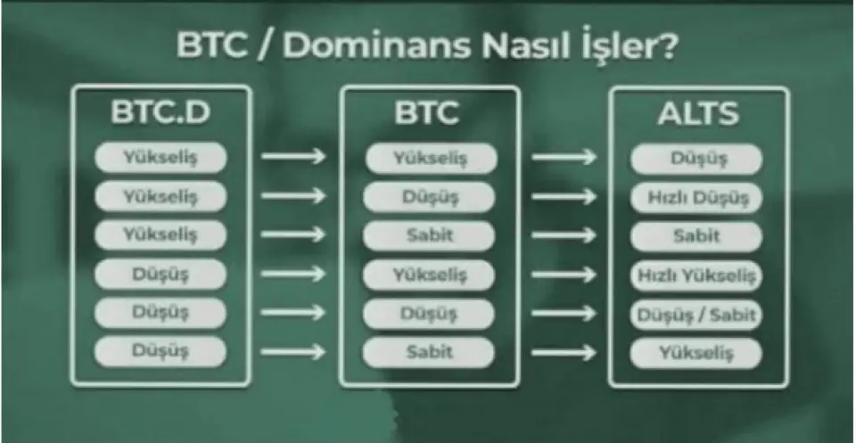 Eğer BTC Dominance yükselirken Bitcoin stabil hareket ediyorsa, altcoinlerde genellikle stabil hareket ederler. Eğer BTC Dominance düşüyor ama Bitcoin yükseliyorsa, altcoinler hızlı yükselişler yaşarlar. Bunun sebebi ise, Bitcoin’den altcoinlere para akışı olduğu içindir.