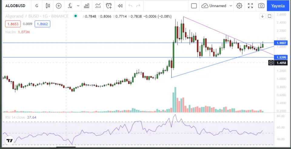 #ALGO günlükte 1,90 direncini test ediyor. üstünde kapanış yaparsa 2,10 ları test edebilir