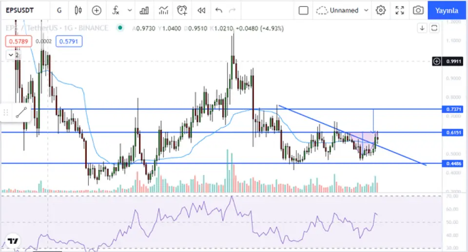 Elipsis coin 0,61 dolarda tutunuyor. İşlem hacmi artışıyla beraber, 0,73 dolar gibi fiyattan test edebilir.