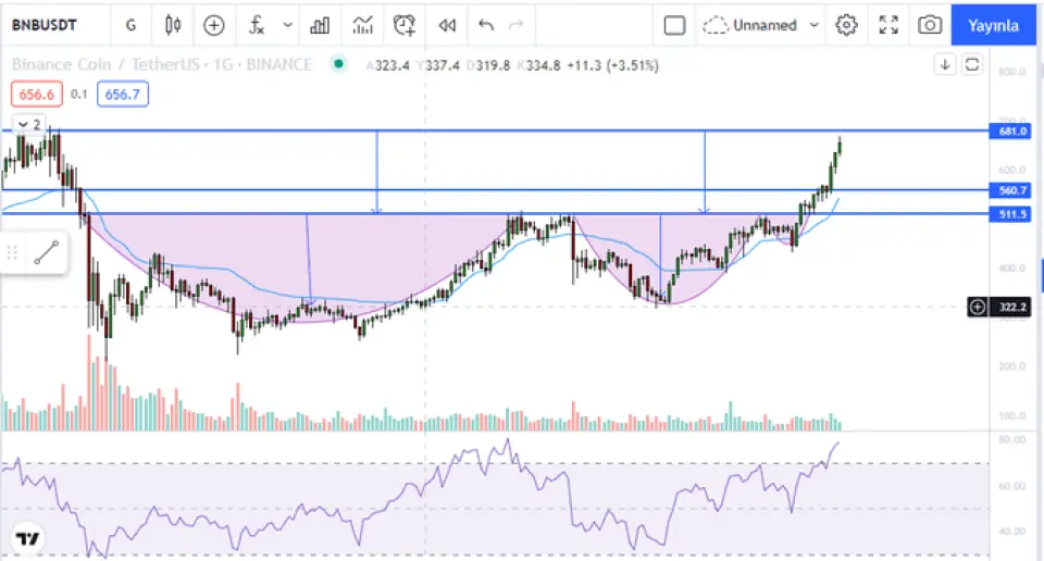 560 $ üstü kapanışlarda tarihi zirvesini tekrardan teste başlayacağını söylediğimiz BNB zirveye doğru ilerlemeye başlıyor gibi görünüyor.