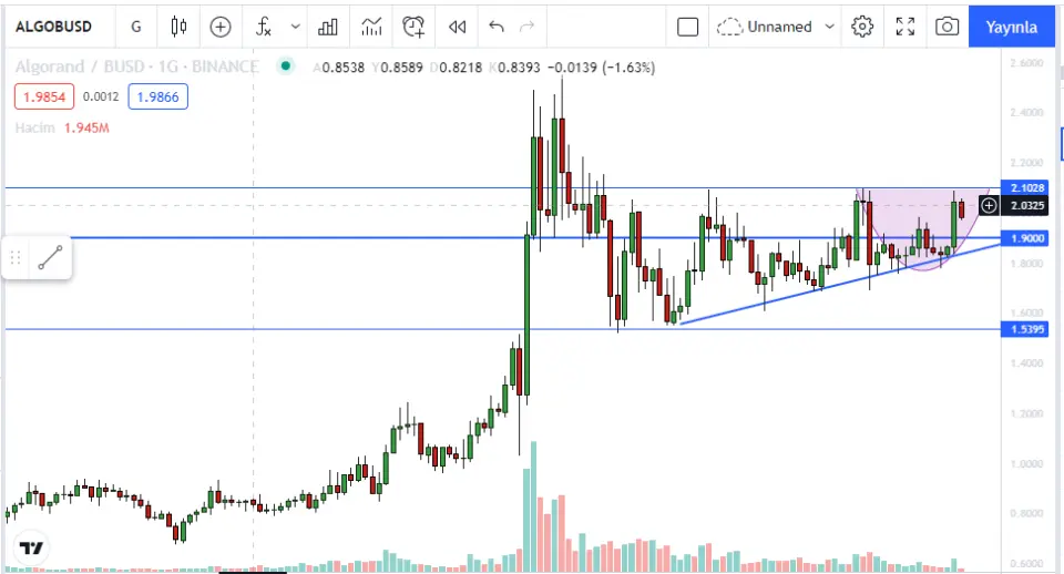 #Algorand üst kanalı test edip geri çekildi, artık bir üst kanalda. Olası hacimli alışlar sonrası 2,10 lu seviyeler geçilebilir. Yeni maceralara doğru yol alır.