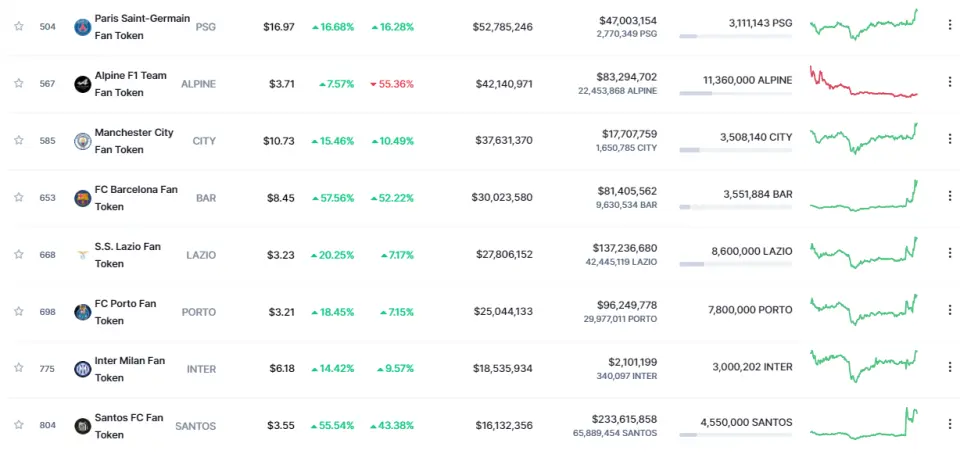 Yükseliş hareketiyle birlikte PSG token 15 doları, CITY (Manchester City token’ı) ve Barcelona 10 doları, Santos ve Porto da 4 doları aşmayı başardılar. Atletico Madrid, Milan, Roma ve Juventus’ta da yüzde 25’ten fazla artış meydana geldi.