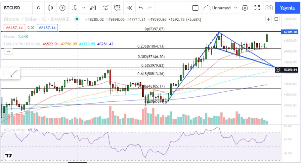 Ekim ayında yaklaşık 20 günde 20 bin dolarlık ralli başlatan ve 60 bin doların üzerinde sağlam şekilde tutunmaya devam eden Bitcoin’de dün akşam itibariyle yeni bir fiyat hareketi de yaşandı. En büyük kripto para, 62 bin dolar civarından birkaç saat içinde 65 bin doların üzerine çıkmayı başardı.