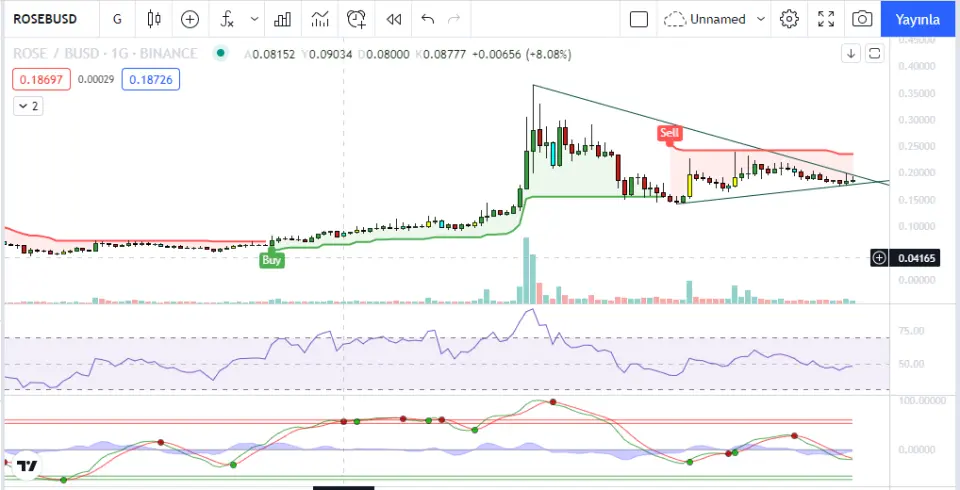 #rose günlük grafikte iyice sıkışmış, yatay trentte seyrediyor. Göstergeler sat konumunda hala ,hacimli alışlar gelir ve 0,20 üzerinde günü kapatırsa olumlu senaryoya dönebilir.#roseusdt #rosebusd