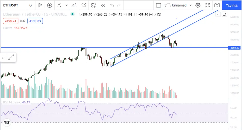 #Ethereum günlük grafikte , yükselen kanalı kırdıktan sonra daha önce çizdiğimiz destekten döndü. 4000$ civarı olan seviyemiz önemli bir destek . Altında kapanış gelmediği sürece olumlu senaryo geçerli olabilir. #ETH #ethusdt #ETHUSD