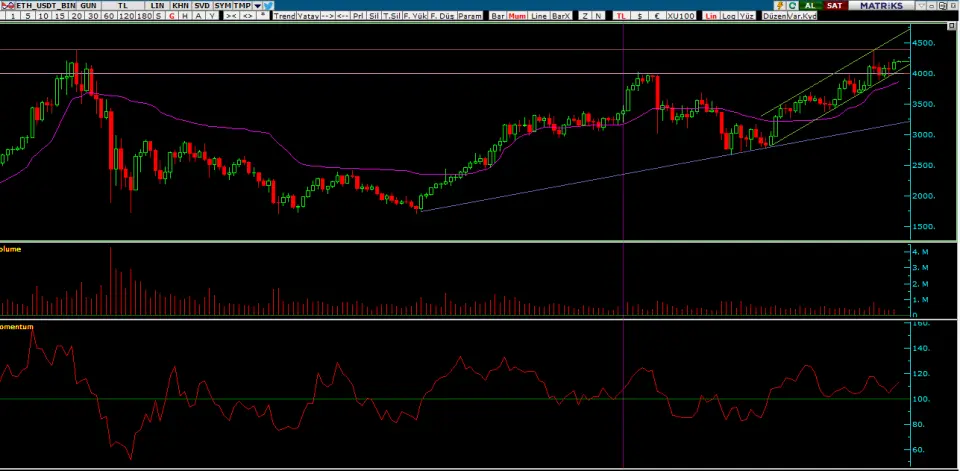 ETH fiyat çizelgeleri yükseliş eğilimi gösteriyor .İsabetli tahminleriyle yatırımcılara yol gösteren analistimiz KRYPTOTURK 'ün de daha önceki teknik analiz yorumlarında vurguladığı gibi ,4000 altı fiyatlanmalar olmadığı müddetçe ,hedef ilk zirve 4372 dolar.