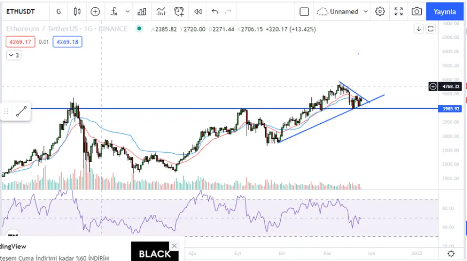 16 Kasım daki büyük düşüşün ardından Ethereum (ETH) yatay trendde devam ediyor. 16 Kasım da 4560 dolardan 4106 dolara kadar düşmüş ve çıkan trendi kırmıştı. Son bir haftayı 4000-4300 bandında sıkışık geçiren Ethereum , hala 4300 direncini kırmaya çalışıyor. Uzman teknik analistimiz Kryptoturk Ethereum teknik analizini yorumladı: