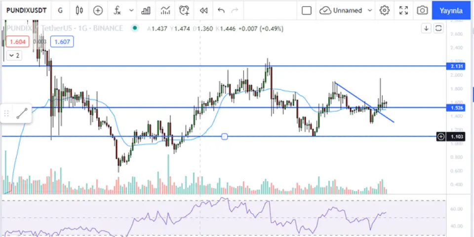 Günlük grafikte 1,52 dolar üstünde yatay trende devam ediyor. Bu fiyatın altına inmediği sürece olumlu senaryo devam eder. Olası bir yukarı harekette 2,13 dolar hedef fiyat olarak görülüyor. Pundix şuanda 1,62 dolardan işlem görüyor.