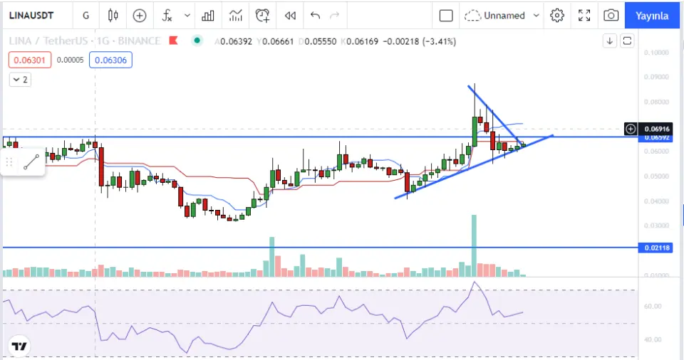 #Lina dikkat çekici görünüyor. Grafik oldukça sıkışmış . 6590 üstü kapanış olumlu hareketlere sebep olabilir.60 altı kapanışlar 52 ye kadar düşüşlere yol açabilir. Takip etmek lazım.#linausdt