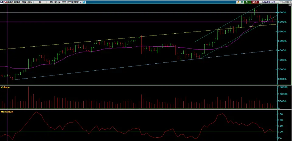 #BTC günlük grafikte , gelen satış sonrası kanalı kırarak kanal dışına çıktı ve 60000$ desteğinde tutundu. Kaufman hareketli ortalamasından destek alıyor. Momentum 100 günlük seviyelerinde güç topluyor olabilir. Olumlu senaryo için 63000$ üstü fiyatlar gerekebilir.#bitcoins#BITCOIN