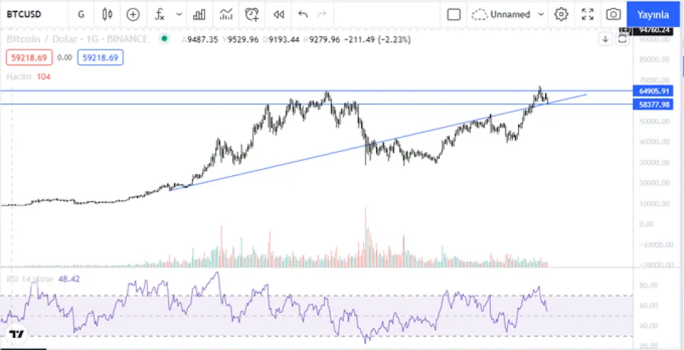 Artık buralarda tutunması lazım 58300 $ altındaki kapanışlar tehlikeli sulara girer.