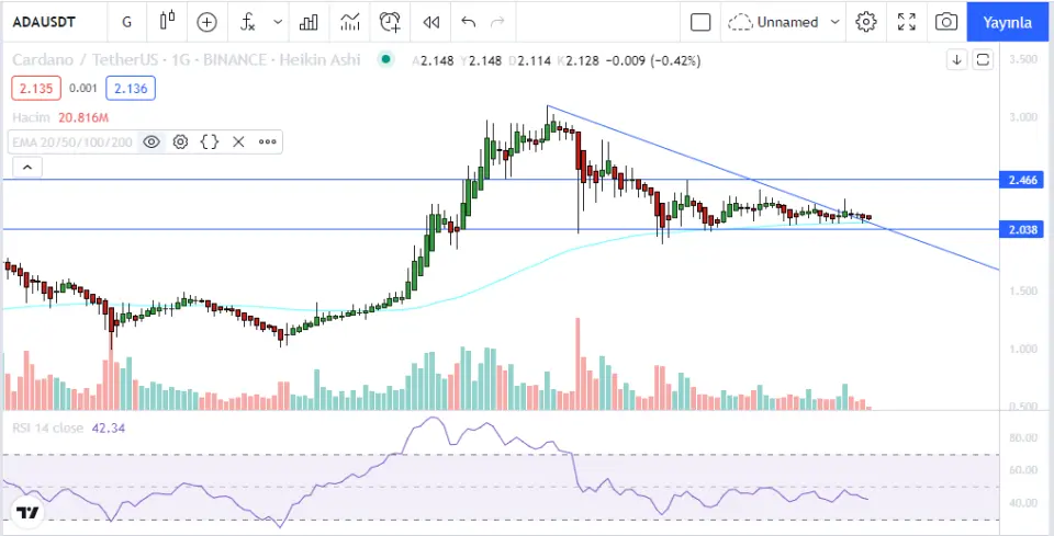 Cardano günlük grafikte düşen trendi kırdıktan sonra ,trend üstünde tutunmaya çalışıyor. 100 günlük hareketli ortalamadan destek alarak tutunmaya devam ediyor. Yatay harekete devam edecek gibi bir görünüş içinde. Hacimli alışlar gelirse 2.30- 2.46 gibi fiyatları test edebilir.