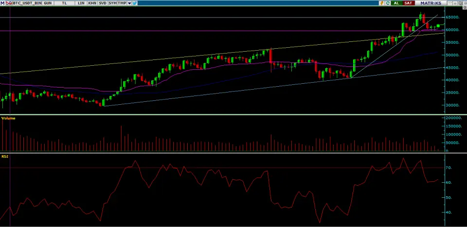 BTC günlükte 59500 seviyelerinde tutunmaya çalışıyor. 22 Ekim de yükselen trendi aşağı yönlü kıran Bitcoin Kaufmann hareketli ortalaması ve 59500 desteğinden güç alıyor. Bu bölgede bir süre yatay hareket yapabilir. Mum grafikte , dojiler yanmaya başlamış . Bu grafiğin bir süre daha yatay devam etmeye meyilli olduğu anlamına gelir. Şu anda 59500 -65000 geniş bandında hareket ediyor. Senaryonun tam olumlu olması için 65000 üstünde yeni bir kapanş yapması gerekir. 20 Ekim de denedi ve kapattı fakat ertesi gün sert düştü. Sonraki gün yükseleni kırdı. Kararlılığı devam ederse yeni zirveler ve yeni yüksek dipler yapacaktır.