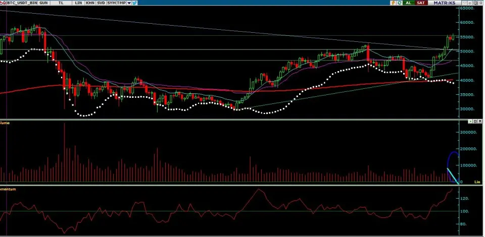 btc/usd günlükte sert yükselişinin ardından 55500 direncine takılıp geri dönen bitcoin bir sonraki denemesinin ardından da kıramayıp kırmızı mumu yaktı. Bugün ise tekrar gün içinde 55500 ü test edip yatayda ki hareketine devam ediyor. Düşen hacim ise gözlerden kaçmıyor.