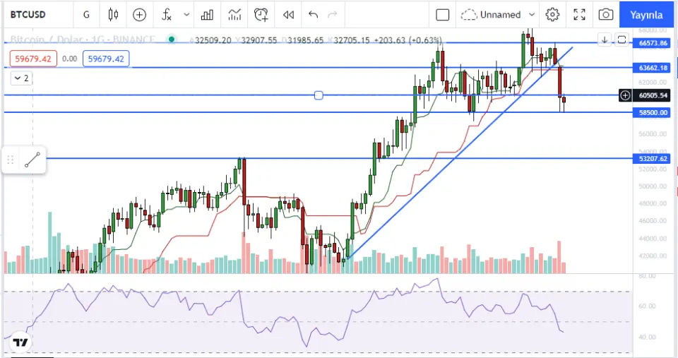 #BTCUSD günlük grafikte yükselen trendi kırdıktan sonra düşmeye devam ediyor.60500 kapanışı olmadı .Artık 58500 üstünde tutunmalıdır. Satışların devam etmesi halinde 53000 lu seviyelere kadar gelebilir. Bugün 58500 önemli..#bitcoin