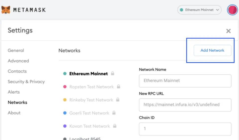 Binance Smart Chain’i eklemek için sağ üst köşedeki Add Network’e tıklayın. Binance Smart Chain seçeneği mevcut olmadığı için parametreleri ayrı ayrı girmeniz gerekir.