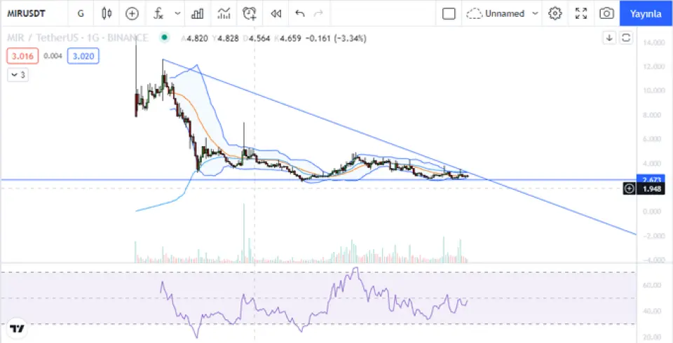 MIR Coin grafiği günlükte sıkışıyor . 3,1 üzerinde günlük kapanış sergilerse alçalan trendi kırmış olan MIR Coin yeni zirveler için ATH yapabilir.