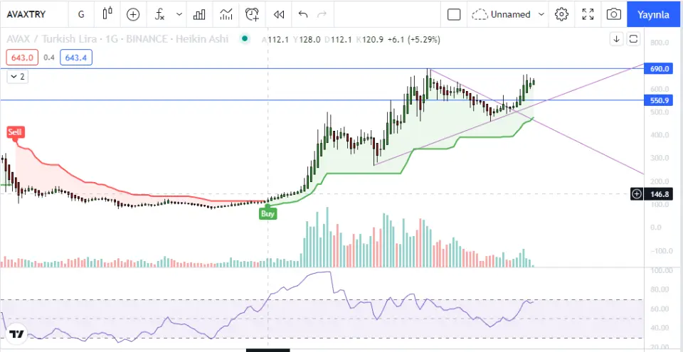 Avax, günlük grafikte 665 lerden tepki alıp bir miktar geri çekildi. Alışların devam etmesiyle ilk önce tarihi zirvesi olan 690 ları deneyecektir.