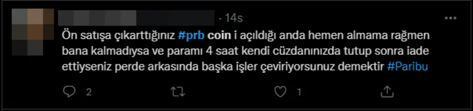 Dün ünlü Türk kripto para borsası Paribu kendi kripto parasını ön satışa çıkartmıştı. Twitter sosyal medyasında bir çok paylaşım yapan kişiler mağdur olduklarını ve yatırdıkları tutarı iade edildiğini belirttiler. Dün saat 14:00'da ön satışa çıkan PRB Coin, 14:01'de aldıklarını iddia eden kişiler bile iade tutarını alıp ön satışa dahil olamadıklarını ve bu konuda bir çok kişinin şikayeti olduğunu belirttiler. 12 TL'den PRB coin alanların bir kısmını onay ekranı geldiği halde iade yapılarak, paraları da iade edilmiş. Bu konu ile alakalı şikayette bulunan yatırımcılar Paribu sitesinde ki canlı desteğe bağlandıklarını, Paribu yetkililerin yatırımcılara arzın tükendiğini belirtmişler. İşte şikayetlerin bazıları;