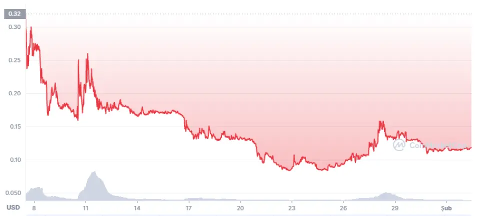 Coinmarketcap verilerine göre, düne göre %1.88 artış ile, $0.1175'dan değer görüyor. Alınan 1 aylık grafik verisine göre, çok ciddi bir düşüş yaşandığı gözlemleniyor.