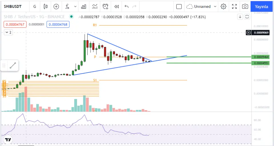 Sıkışmaya devam ediyor artık patlama yakın olması lazım. $0.00004550 altı kapanış olumsuz, $0.00005464 üstü kapanış olumlu senaryoları hazırlar.