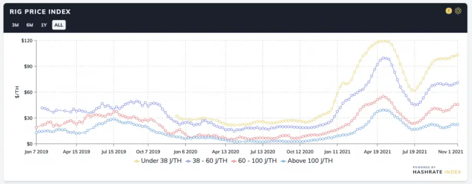 Tipik olarak, madencilik donanımı üreticileri ve komisyoncuları, herhangi bir fiyat rallisine bağlı olarak hem spot hem de gelecekteki hisse senetlerinin fiyatlarını hızlı ve orantılı bir şekilde arttırır. The Block'un bildirdiğine göre , geçen yıl bu noktada Bitcoin'in boğa rallisi sırasında hem spot hem de gelecekte ki ekipman arzı azalmaya başladı ve teçhizat fiyatlarının tırmanmasına neden oldu . 2021 yılının Aralık ayı ortasından 2021 yılının Nisan ayı ortasına kadar, Bitcoin'in fiyatı ve Bitcoin teçhizat spot fiyatı yaklaşık 19.000 dolardan yaklaşık 66.000 dolara çıktı ve yaklaşık 2,5 kat arttı. Ancak Çin'in madencilik alanındaki baskıları, arz ve talep arasındaki dengeyi değiştirdi.