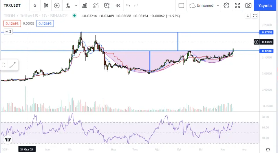 #TRON günlük grafikte kulp olayına girişmiş. 0,12 üstü kapanışlar tarihi zirvesini test ettirebilir. #TRX