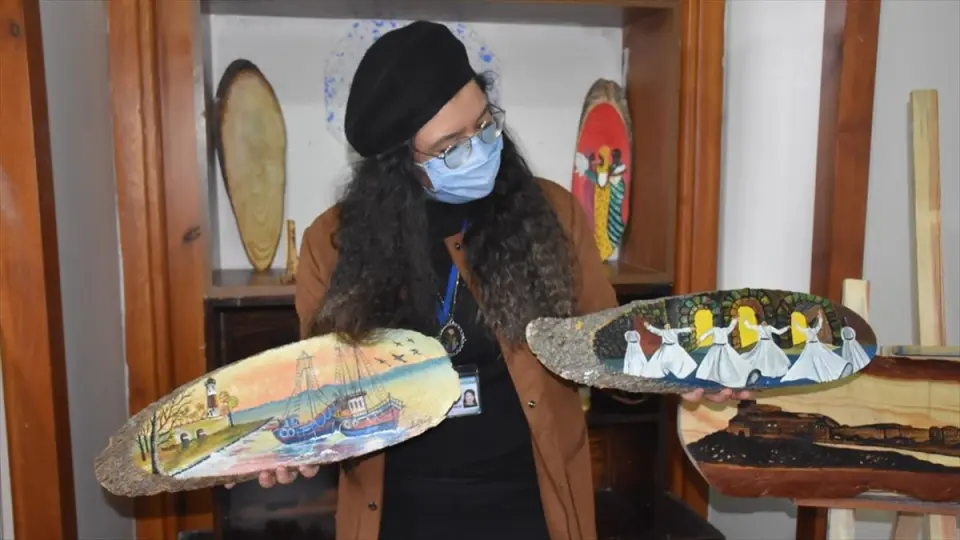 KARS (AA) - Karslı ressam Zennure Çelik, kentin tarihi dokularını resmettiği ağaç parçalarını sanat eserine dönüştürüyor.