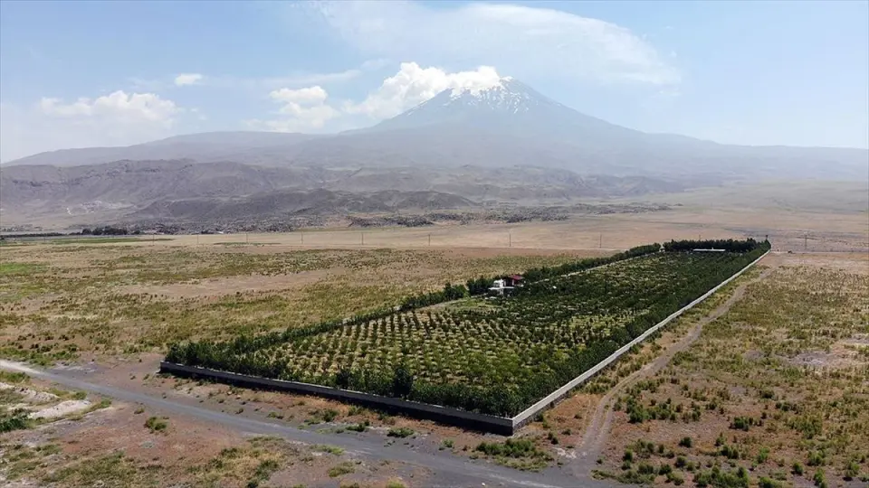 AĞRI(AA) - Doğubayazıt ilçesine bağlı Örtülü köyündeki 5 bin 137 metre yüksekliğinde bulunan Ağrı Dağı eteklerinde meyve bahçesi kurmak isteyen Abdulkadir Ardin, 2015 yılında buradaki 33 dönümlük çorak araziyi satın aldı.