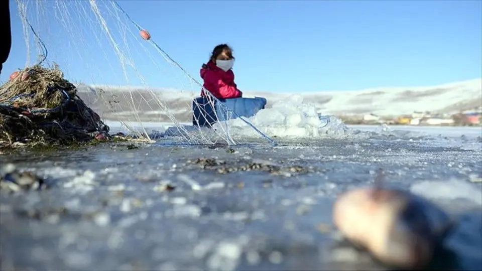 Erken saatlerde hazırlanan balıkçılar, buzla kaplı gölde yürüyerek ağlarını bırakacakları alana geliyor. Burada kazma ve küreklerle buzu kıran balıkçılar, ağlarını suya bırakarak nasiplerini arıyor.