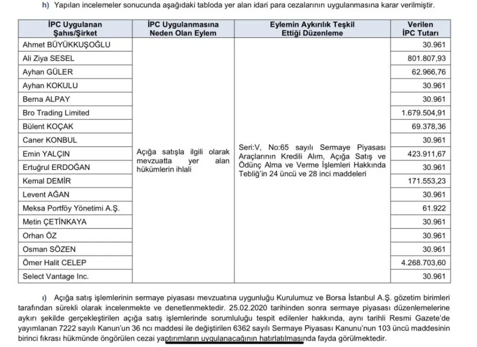 Spk açıklamasında ,Açığa satış işlemlerinin sermaye piyasası mevzuatına uygunluğunun sürekli olarak incelenmekte ve denetlenmekte olduğu ve 25.02.2020 tarihinden sonra sermaye piyasası düzenlemelerine aykırı şekilde gerçekleştirilen açığa satış işlemlerinde sorumluluğu tespit edilenler hakkında, aynı tarihli Resmi Gazete’de yayımlanan 7222 sayılı Kanun’un 36 ncı maddesi ile değiştirilen 6362 sayılı Sermaye Piyasası Kanunu’nun 103 üncü maddesinin birinci fıkrası hükmünde öngörülen cezai yaptırımların uygulanacağının hatırlatılmasında fayda görülmektedir,denildi.