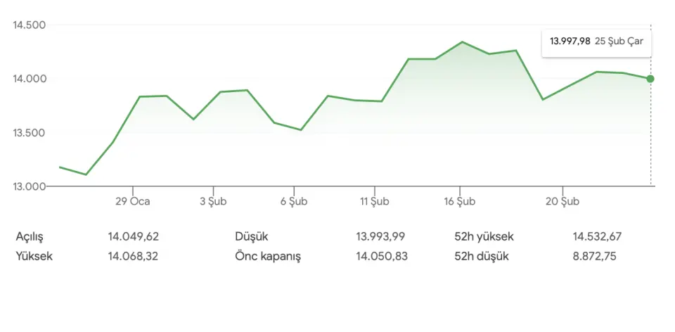 25 Şubat 2025 tarihli işlem gününe Borsa İstanbul'da BIST 100 endeksi, yüzde 0,01 düşüş ile 14.049,62 puandan başlangıç yaptı. Önceki gün satış ağırlıklı bir seyrin hakim olduğu Borsa İstanbul'da BIST 100 endeksi, günü yüzde 0,08 azalış ile 14.050,83 puandan noktaladı.