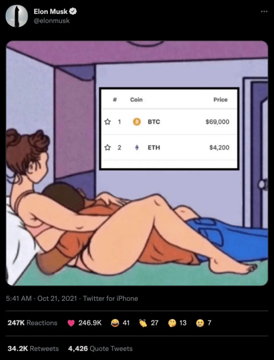 Elon Musk'dan olay tweet ! Ünlü milyarder sabahın erken saatlerinde, Twitter’a gitti ve dikkat çeken bir paylaşım yaptı. Musk, yataklarından Bitcoin (BTC) ve Ethereum (ETH) fiyatlarına bakan bir çiftin resmini yayınlayarak en büyük iki madeni parayı biraz daha yükseğe itti.