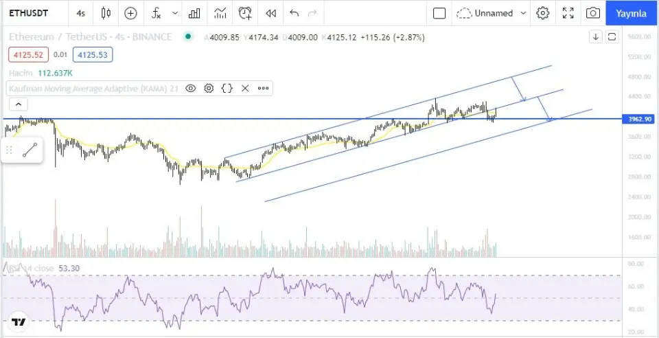 Ethereum 4 saatlik grafiğinde düştüğü kanalı tekrar zorlamaya başladı . 4.200'lü seviyelerde kapanış geldiğinde kanal içine girer . Alışların devam etmesi sonucu 4.600'leri zorlayabilir.