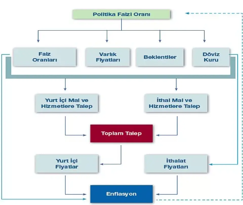 Şimdi bu etkileşim zincirini daha iyi anlayabilmek için politika değişikliğinin, politika faizlerini düşürme yönünde olduğunu varsayalım ve bunun enflasyonda nasıl bir değişikliğe neden olacağına bakalım: