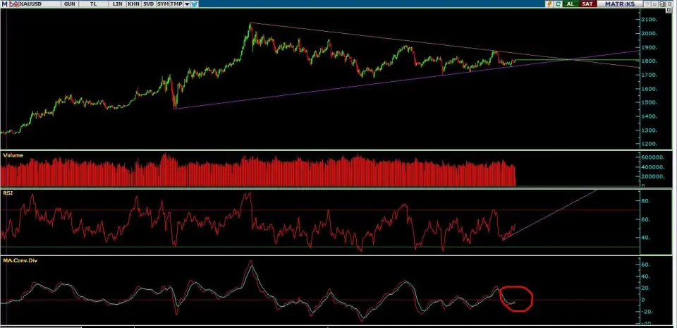 Ons Altın teknik analizde ,oldukça sıkışmış. MACD indikatörü alış için uygun pozisyonda .RSI pozitif uyumsuzluk sergiliyor. Yukarı yönlü sinyaller görünmeye başlamış. 1850 dolar , şu anki trendin içinde görünen ilk hedef konumunda. Şu anda piyasa ilgisi ve işlem hacmi, yükselen trendi onaylıyor. Hacim devam ederse, uzun zamandır içinde olduğu düşen trendi kırıp 1875 dolar fiyatları test edilebilir.