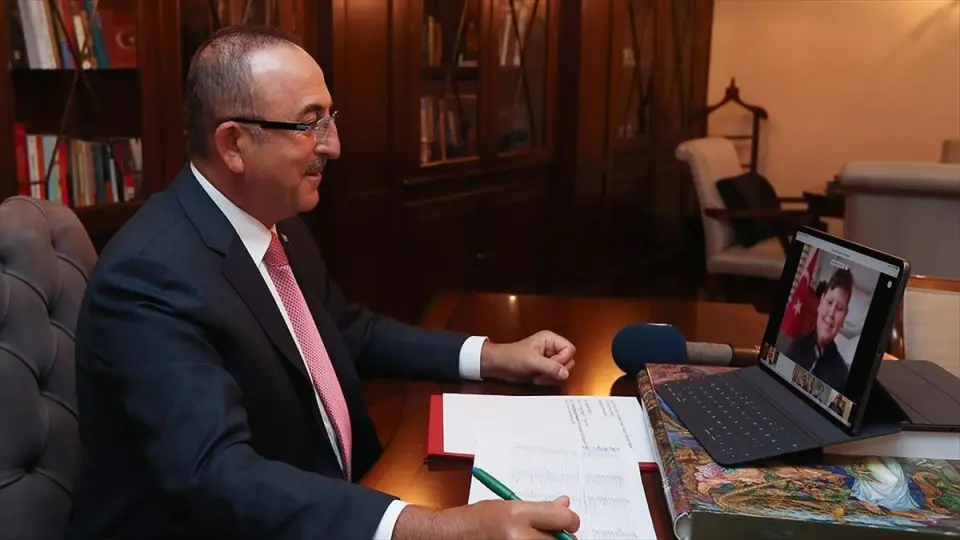 Büyükelçilerle video konferansla toplantı yapan Çavuşoğlu, bu sırada Antalya'ya da bağlanarak makamını şehit çocuğu Nazilli'ye temsili olarak bıraktı.