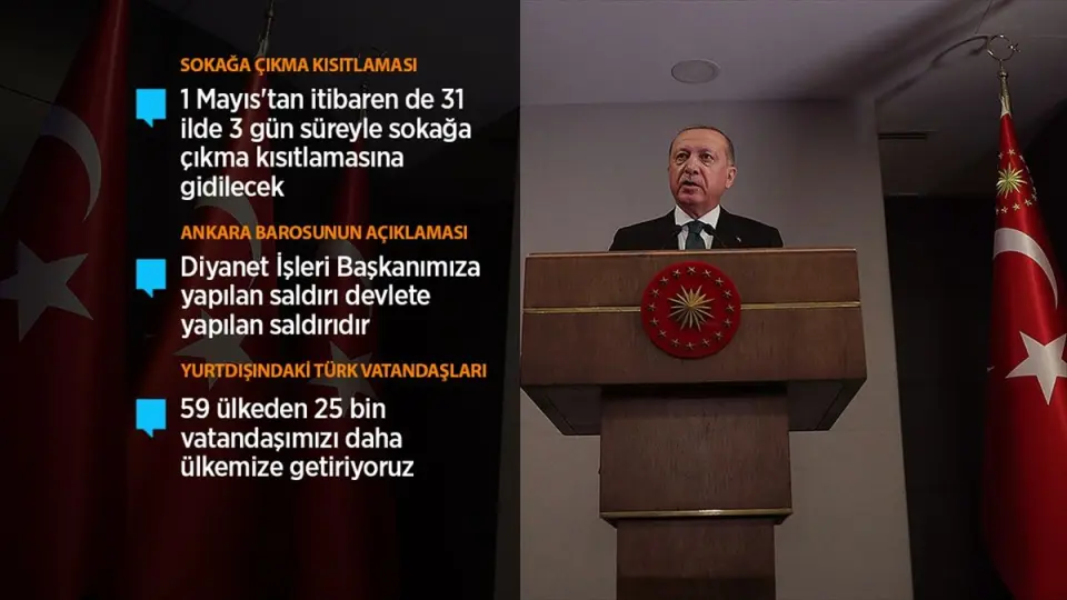 "İnsan hareketliliğini ne kadar azaltırsak, salgının yayılma zincirini o derece hızlı ve etkin kırabiliriz. Salgının kontrol altına alınmasında insanların kalabalık şekilde bir arada bulunduğu okullar, kimi işletmeler, spor tesisleri gibi yerlerdeki faaliyetlere ara verilmesinin büyük katkısı olmuştur. Ülkemizdeki bu güzel gidişi devam ettirmek için hafta sonları sokağa çıkma sınırlandırmasını bayram sonrasına kadar sürdürmeyi düşünüyoruz. Bu hafta sonu da yine 31 ilimizde 3 gün süreyle 1 Mayıs sebebiyle sokağa çıkma sınırlandırması uygulayacağız. Vatandaşlarımızın 1 Mayıs gece 00.00'dan başlayıp 3 Mayıs gece 24.00'e kadar devam edecek şekilde uygulanacak sokağa çıkma sınırlandırmasına hassasiyetle riayet etmesini bekliyoruz. Cuma günü marketler yine 09.00 ile 14.00 arası açık olacak."