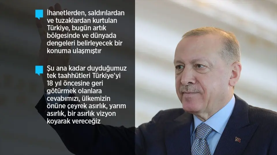 "Salgın krizi sağlık altyapımızın, depremler afet altyapımızın, salgın tedbirleri üretim ve ikmal altyapımızın, eğitim teknolojileri altyapımızın gücünü göstermiştir. Aynı şekilde akıl ve vicdan sahibi herkes, güvenlikten diplomasiye kadar her alanda Türkiye'nin nereden nereye geldiğini görüyor. Daha düne kadar kendi sınırları içindeki teröristlerle mücadele etmekte zorlanan bir ülkeden, neredeyse yarım düzine sınır ötesi harekatı, aynı anda gerçekleştirebilen bir ülkeye dönüştük.