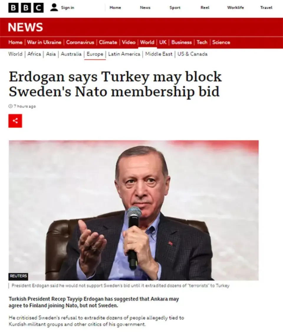 İngiliz BBC, 'Erdoğan, Türkiye'nin İsveç'in NATO üyelik başvurusunu engelleyebileceğini söylüyor' başlığıyla sunduğu haberde Ankara'nın İsveç olmadan Finlandiya'nın ittifaka katılmasını onaylayabileceğini öne çıkardı.